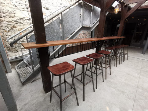 • Bespoke booth tables and bench tops – bespoke powder coated table pedestal frames and solid Iroko
