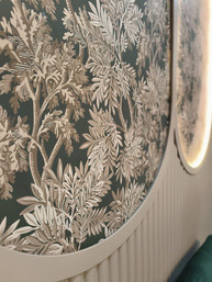 The wall panels were designed to frame wallpaper inserts, it’s a simple but highly effective way to add texture to a feature wall while showcasing wallpaper in a more architectural context.